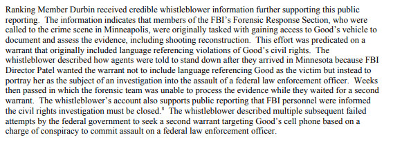 - "BREAKING: Credible whistleblower discloses that FBI forensic experts were ordered to stand down from processing the scene where Renee Good was killed, because Kash Patel did not want Good referenced as a "victim" in the warrant."