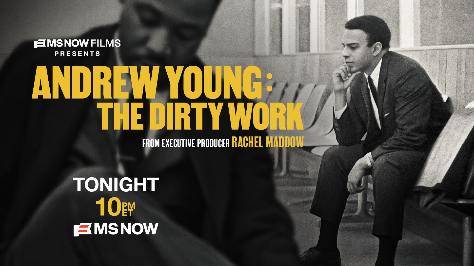 Tonight, MS NOW Films presents an encore presentation of "Andrew Young: The Dirty Work." Executive produced by Rachel Maddow, the documentary retraces Andrew Young's story — in his own words — as a trusted friend to Dr. Martin Luther King, Jr., behind-the-scenes architect of the civil rights movement, and living legend who carried Dr. King's dream forward into Congress, the White House and beyond. Watch tonight beginning at 10 p.m. ET on MS NOW. |