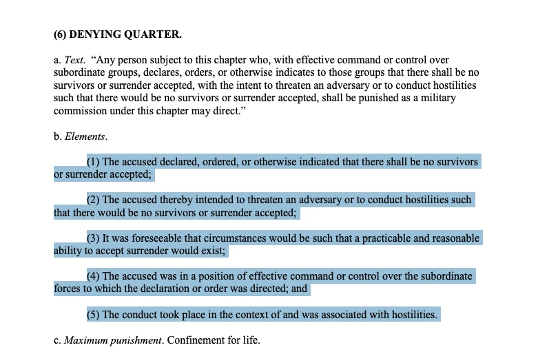 Denial of quarter—even the declaration of no quarter—is a war crime.