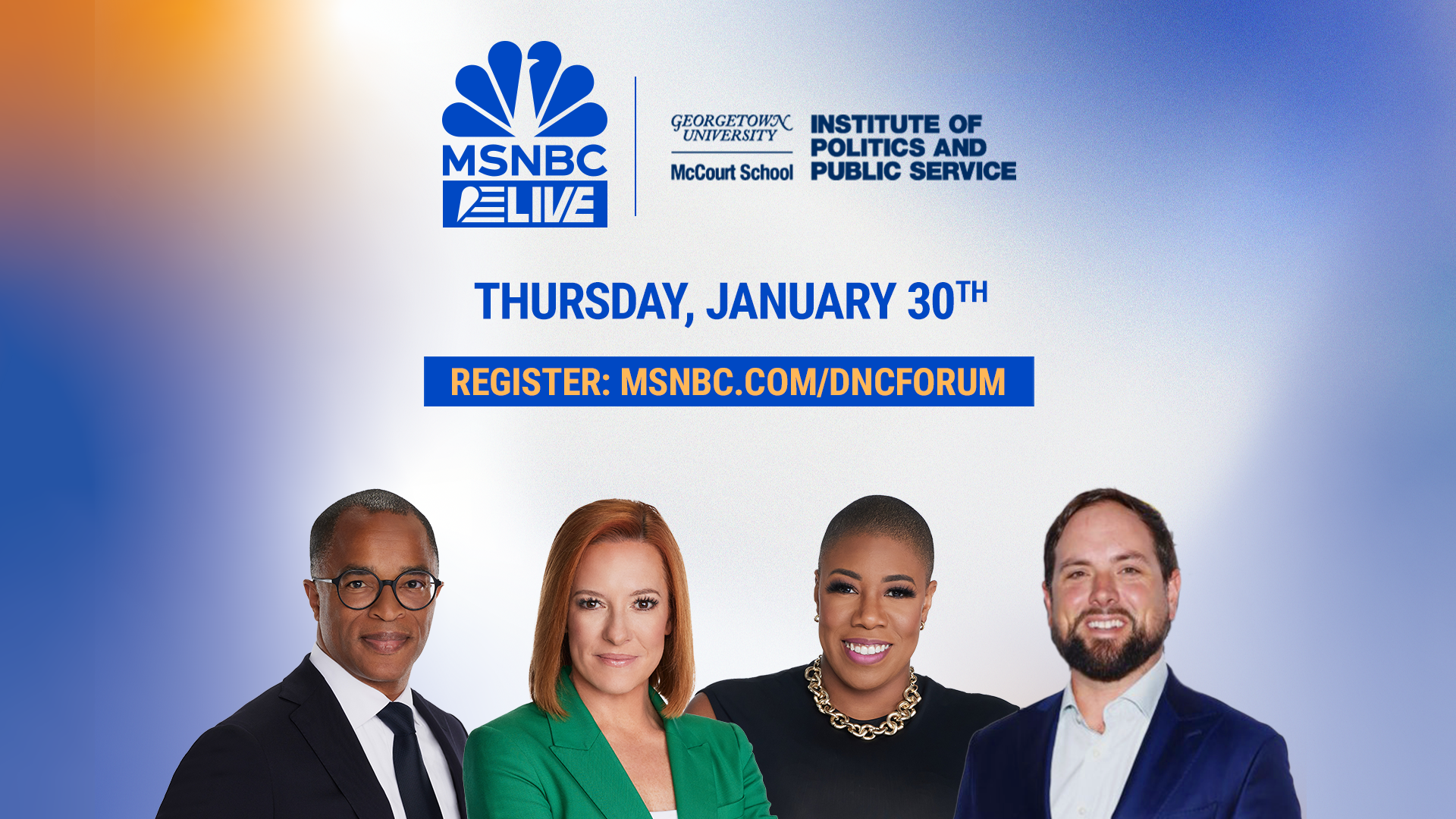 Next Thursday, join Jen Psaki, Symone Sanders Townsend, Jonathan Capehart, and Luke Russert for a virtual forum hosted at Georgetown University. Hear from candidates for Democratic National Committee offices ahead of their leadership elections. Register now. |