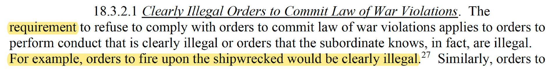 The VERY rule on the "requirement" to refuse illegal orders gives as its paradigmatic example of what is "clearly illegal: "orders to fire upon the shipwrecked.""