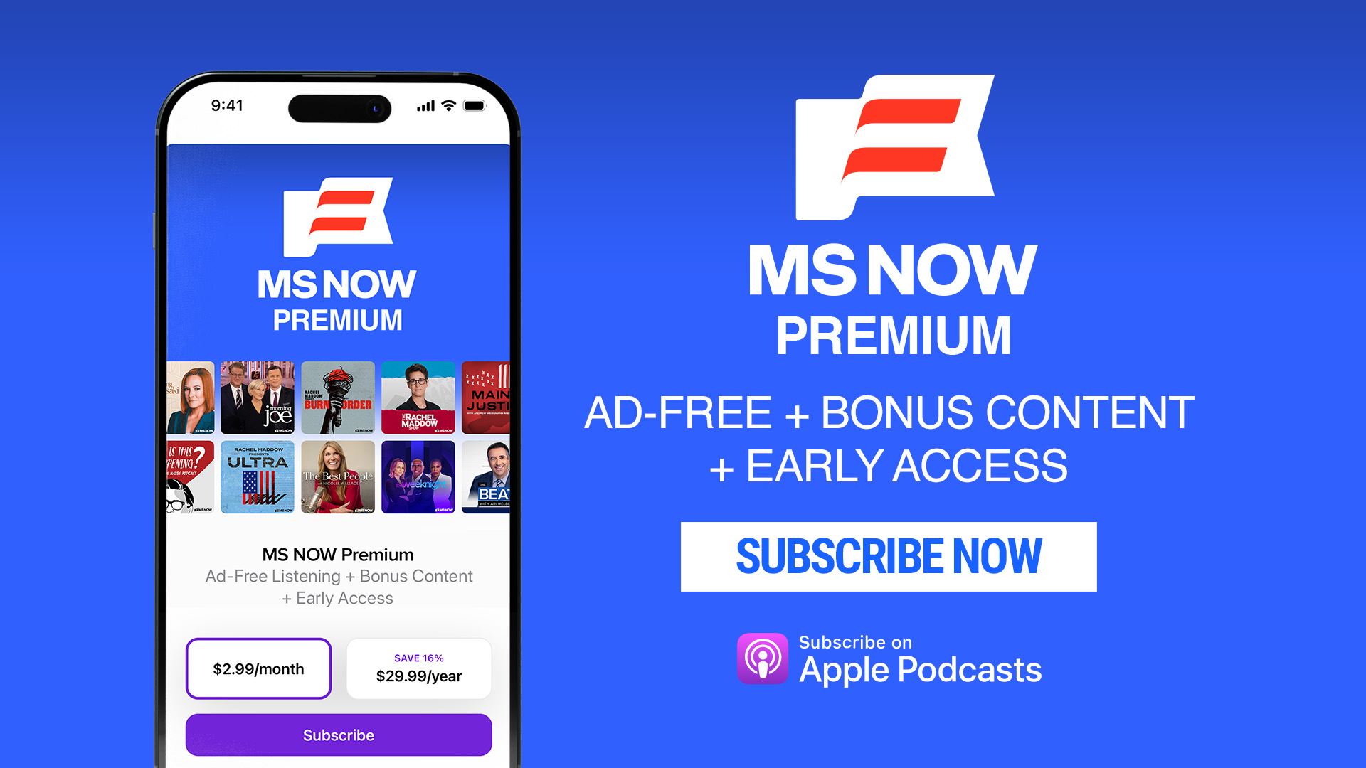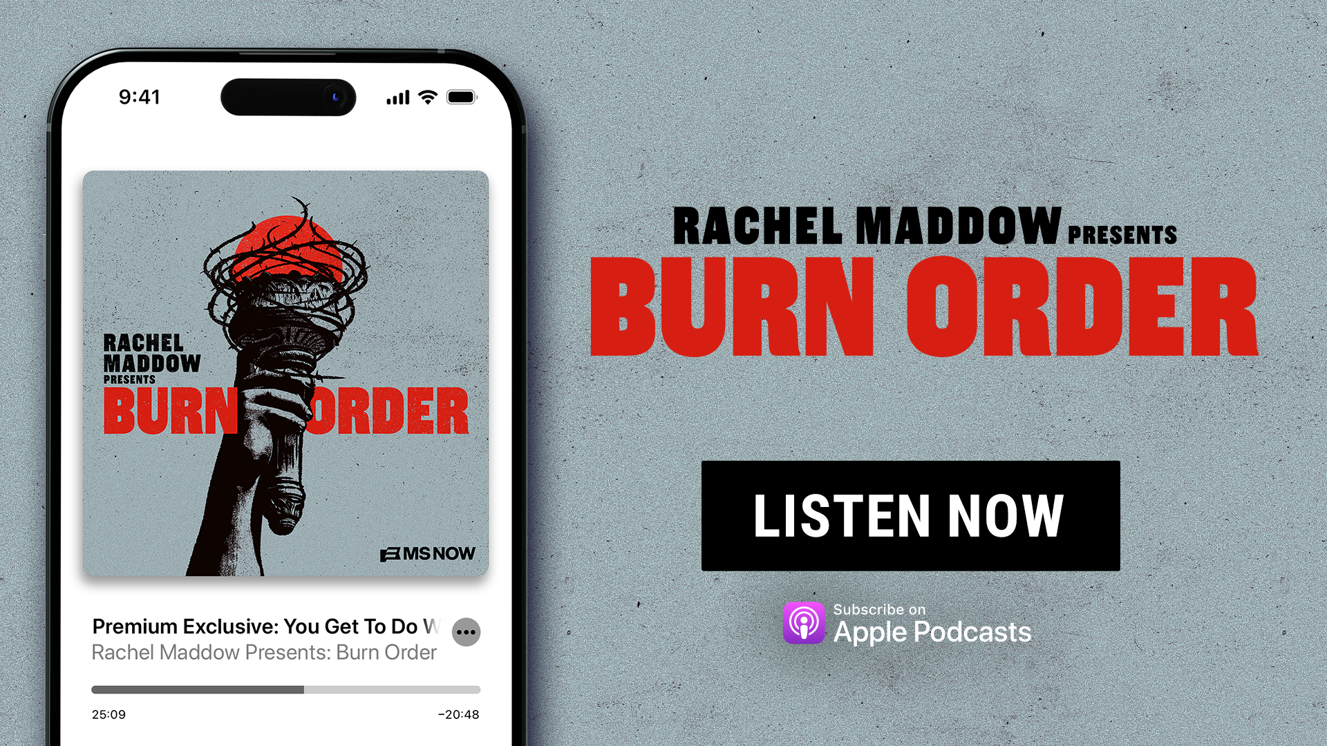 Subscribe to MS NOW Premium on Apple Podcasts for ad-free listening to all of MS NOW's original podcasts, including "The Best People with Nicolle Wallace" and all of Rachel Maddow's chart-topping series, including her most recent podcast, "Burn Order." Plus, enjoy new episodes of your favorite shows like Morning Joe and The Briefing with Jen Psaki, all ad-free. And, get bonus content and early access to select shows. Right now, we're offering a 3-month free trial for subscribers who sign up through the end of January. Subscribe now. |