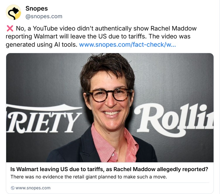 As you know, there has been a rash of AI slop content hijacking Rachel's image and voice for fake stories. Increasingly, our viewers are catching on and flagging bogus accounts, in addition to our own efforts to report them. Now there is some organizing happening in the Daily Kos community to help folks avoid being deceived by these fake accounts.